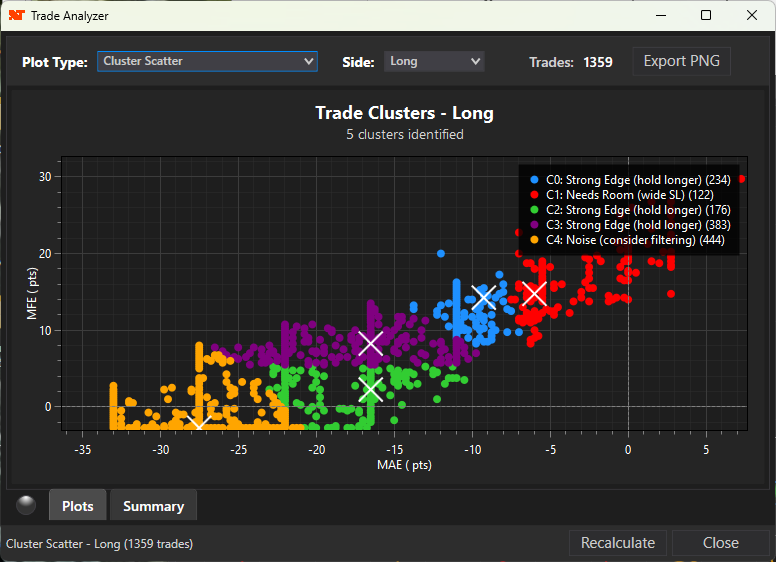 This plot groups your trades into clusters based on similar characteristics, then displays them color-coded on the MFE/MAE scatter: