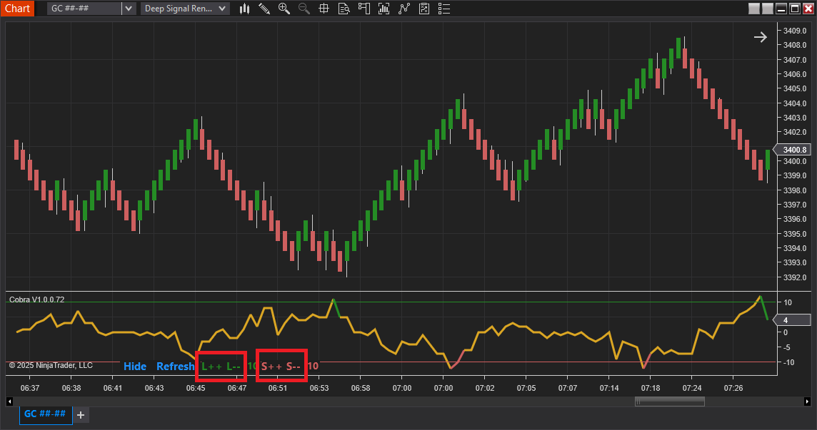 They are also adjustable by clicking on the indicator in the chart on the L++/L-- for increasing or decreasing the Long Points threshold or clicking on S++/S-- for increasing or decreasing the Short Points threshold. After clicking on the buttons on the chart, click on Refresh to refresh the view and update the threshold lines.