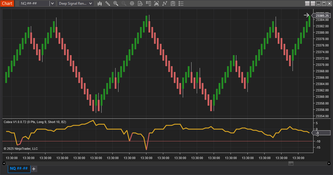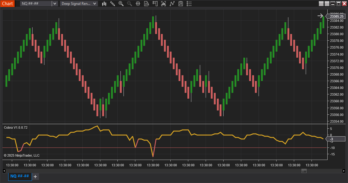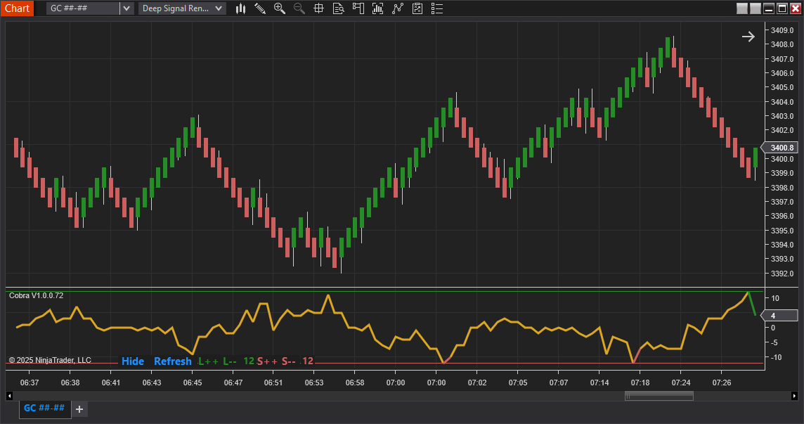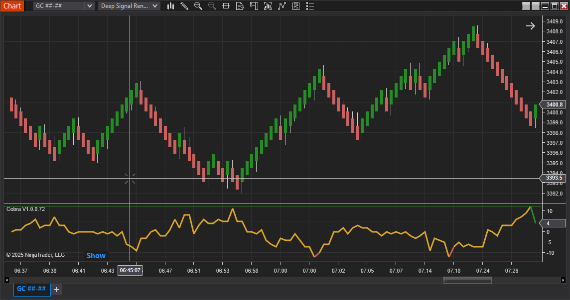 The Deep Signal Cobra indicator is an advanced trend reversal detection indicator for NinjaTrader 8.x, 64 bit. It provides a numeric value that will oscillate from positive to negative. The higher the positive value, the more likely the trend will reverse long. Similarly the more negative the value the more likely the trend will reverse to the short side.