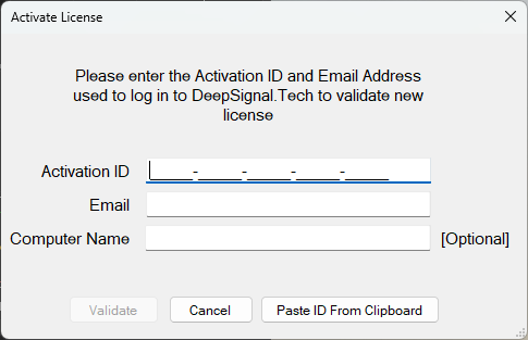 Click on Activate License to get the Activate License dialog. Please enter your Activation ID (from email or in My Account at deepsignal.tech), the email used to log into DeepSignal.Tech and optionally the computer name. Since you can deactivate licenses and put them on a different computer you can add this value to keep track of which computer it is installed on.