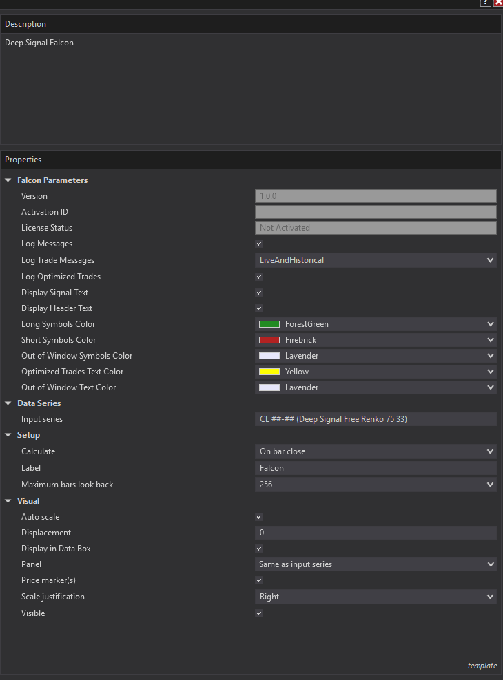 - Input Series – Specifies the data source Falcon uses for analysis. It is recommended to use Deep Signal Free Renko 75 for best results.
