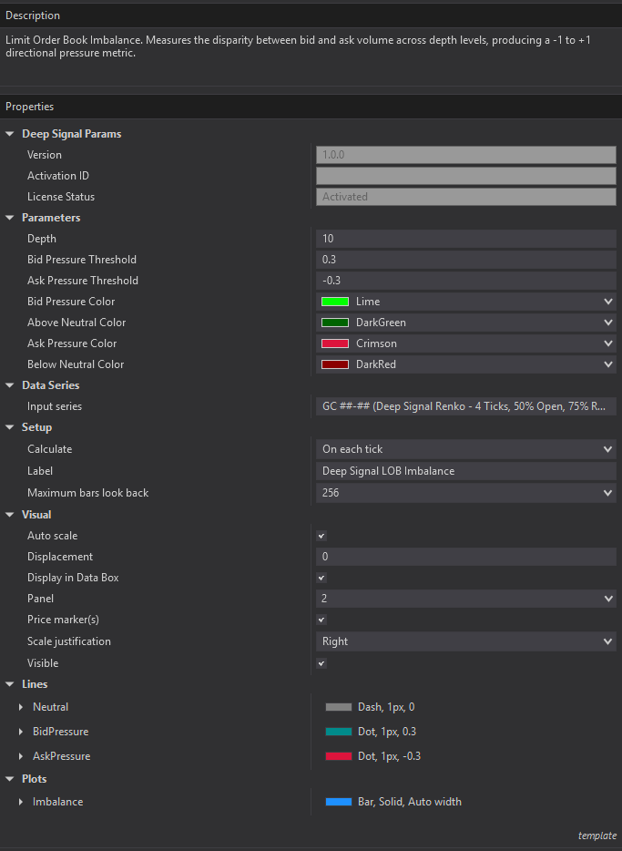 Here is the Properties dialog that contains the LOB Imbalance parameters.