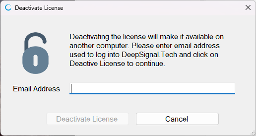 In order to deactivate a license and be able to use it on another computer, you just need to select your license in the License list and click on Deactivate License. You'll need to enter the Email Address used to log into DeepSignal.Tech and click on Deactivate License.