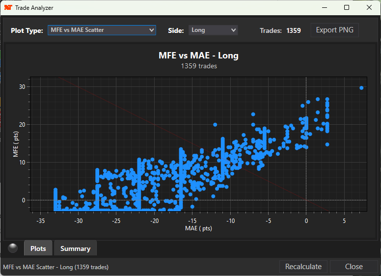 • A vertical zero line - trades left of this had negative MAE (drawdown)