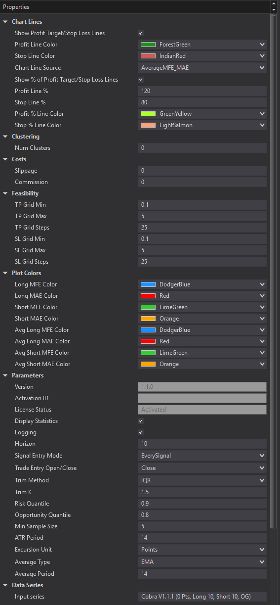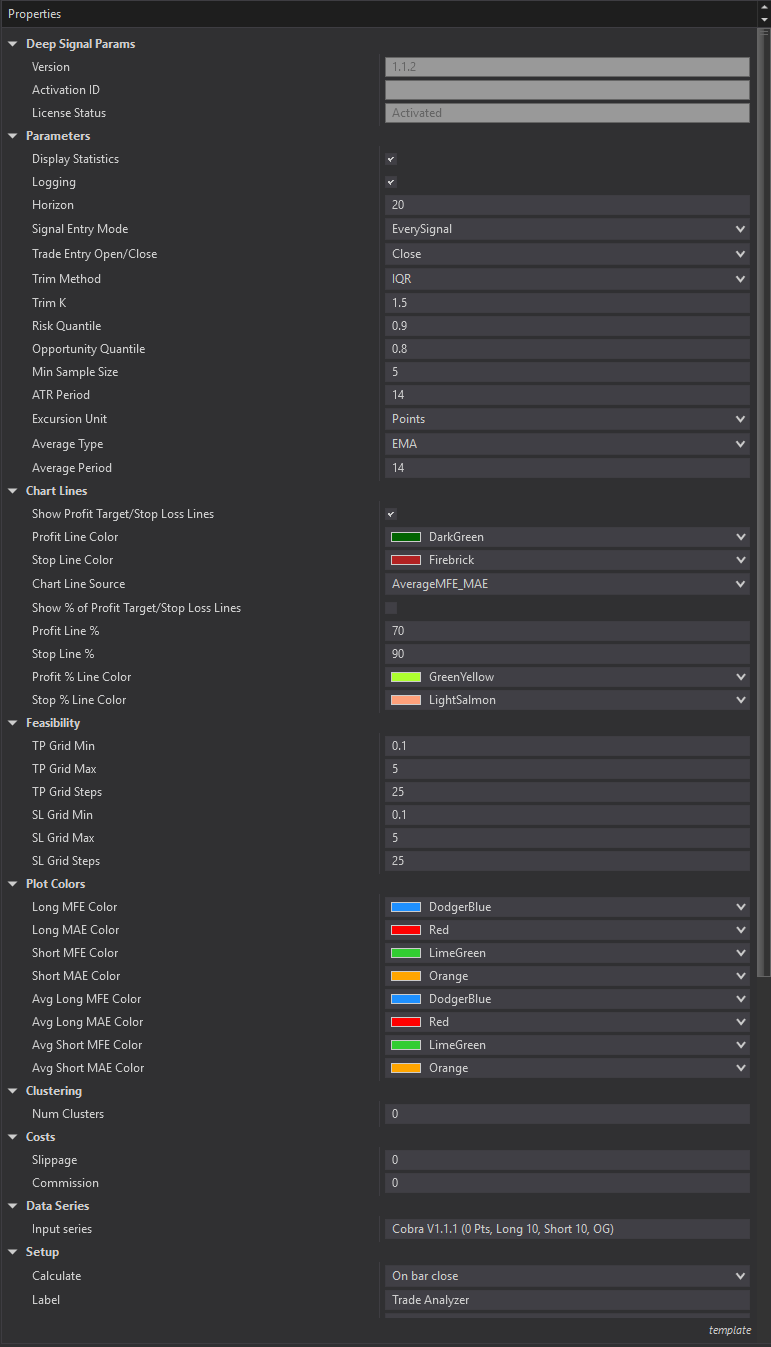 Here is the Properties dialog that contains the Trade Analyzer parameters.