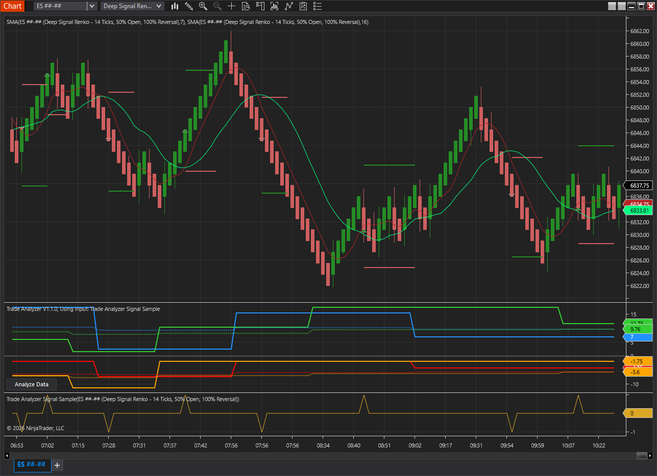 An example indicator is included that can be used as input for the Trade Analyzer. You will need to modify the TradeAnalyzerSignalSample source code to fit your desired trading signal. The sample indicator is not intended to be used for live trading, only an illustration on how to add trade signals to Trade Analyzer.