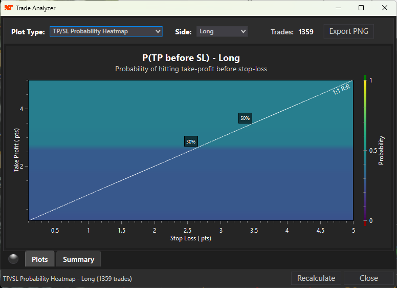 Dark red/purple areas represent TP/SL combinations that almost never work with your signal. If you're trying to achieve 5:1 reward/risk but the heatmap shows 10% probability, the data says this is unrealistic.
