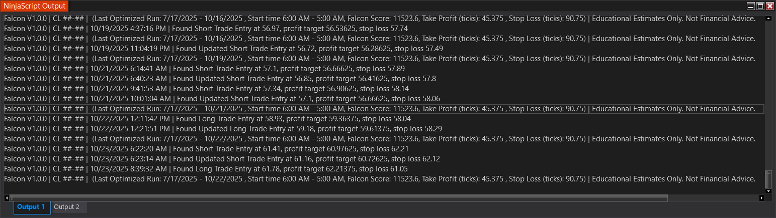 - Log Messages – When enabled, Falcon writes diagnostic messages to the NinjaScript Output Window, which can be useful for reviewing how the model interprets trade conditions.